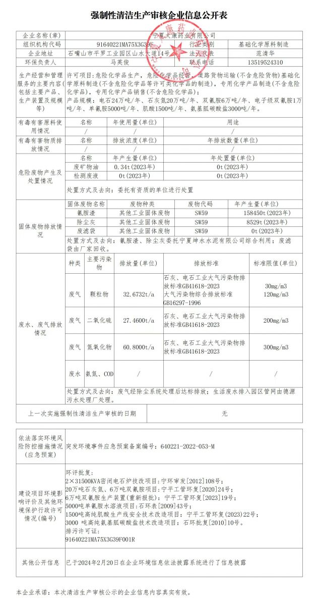 根據(jù)《自治區(qū)生態(tài)環(huán)境廳、發(fā)展和改革委員會(huì)關(guān)于公布 2024 年開展強(qiáng)制性清潔生產(chǎn)審核重點(diǎn)企業(yè)名單的通知》(寧環(huán)發(fā)〔2024〕39 號(hào))文件,公司被納入自治區(qū) 2024 年開展強(qiáng)制性清潔生產(chǎn)審核重點(diǎn)企業(yè),現(xiàn)將公司相關(guān)信息公開公布。